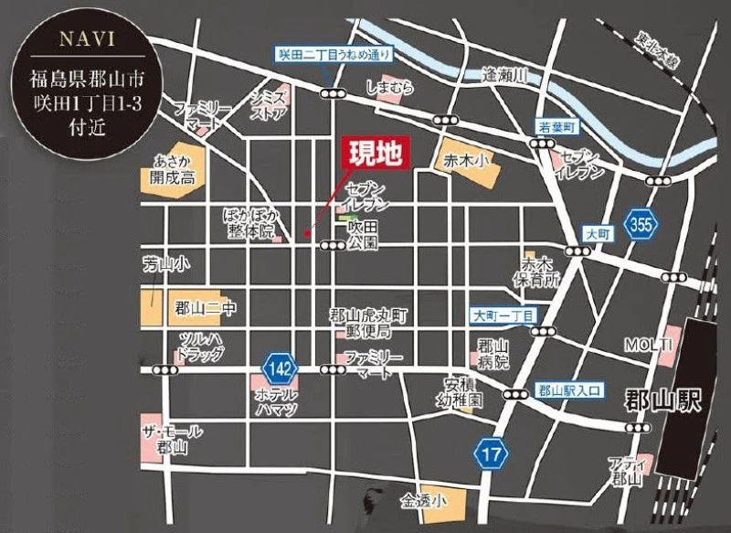 ※地図上の「対象地」は「福島県郡山市咲田1丁目 」付近を示しています。実際の場所ではない場合がございます。詳しくはお問い合わせください。