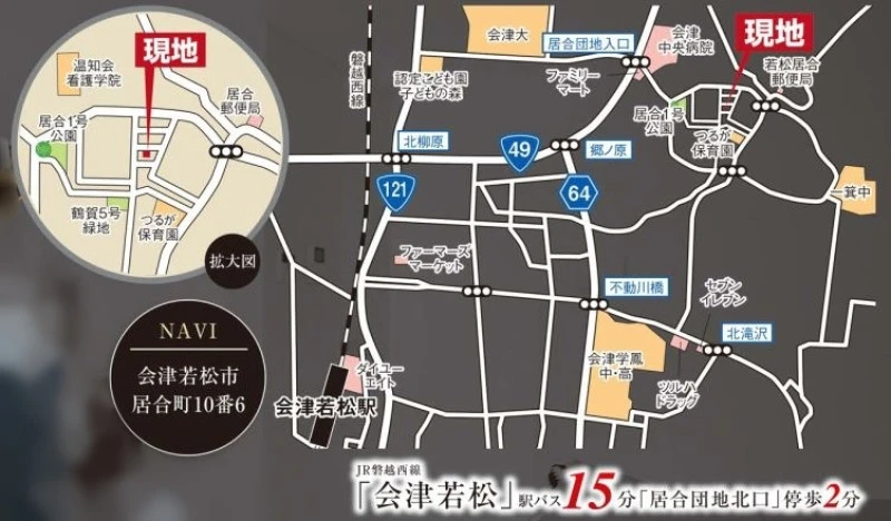 ※地図上の「対象地」は「福島県会津若松市居合町 」付近を示しています。実際の場所ではない場合がございます。詳しくはお問い合わせください。