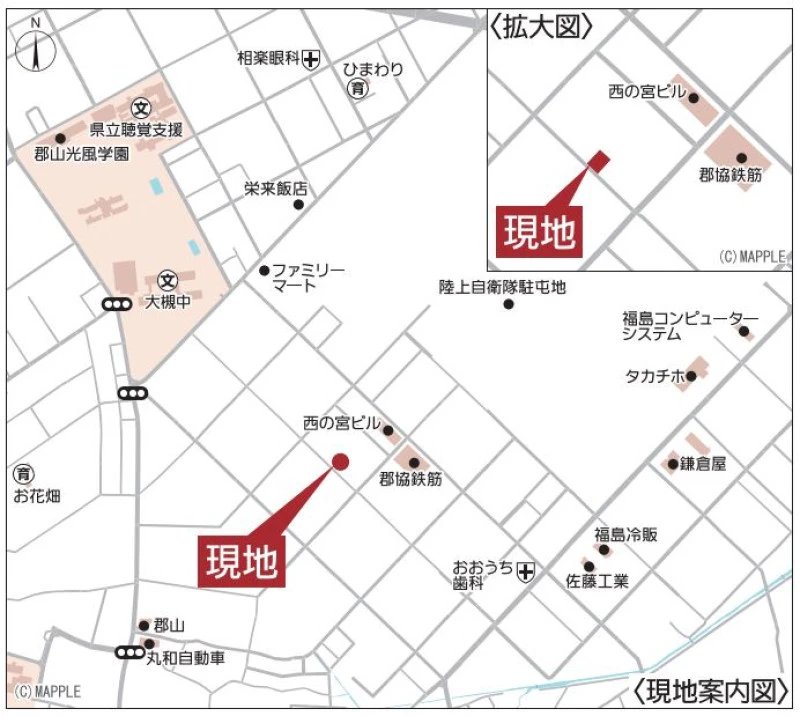 ※地図上の「対象地」は「福島県郡山市大槻町字普門寺坦 」付近を示しています。実際の場所ではない場合がございます。詳しくはお問い合わせください。