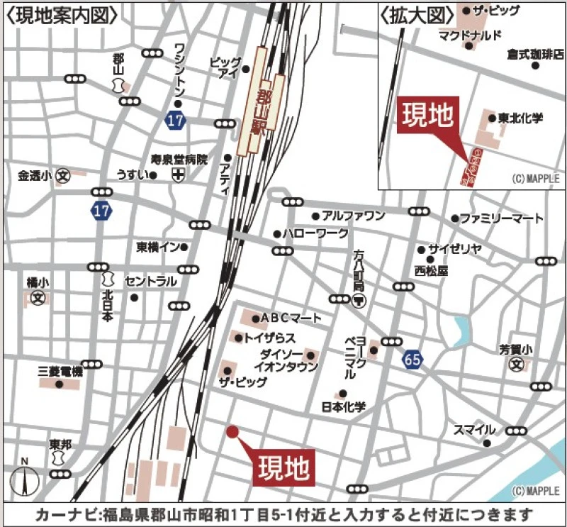 ※地図上の「対象地」は「福島県郡山市昭和1丁目 」付近を示しています。実際の場所ではない場合がございます。詳しくはお問い合わせください。