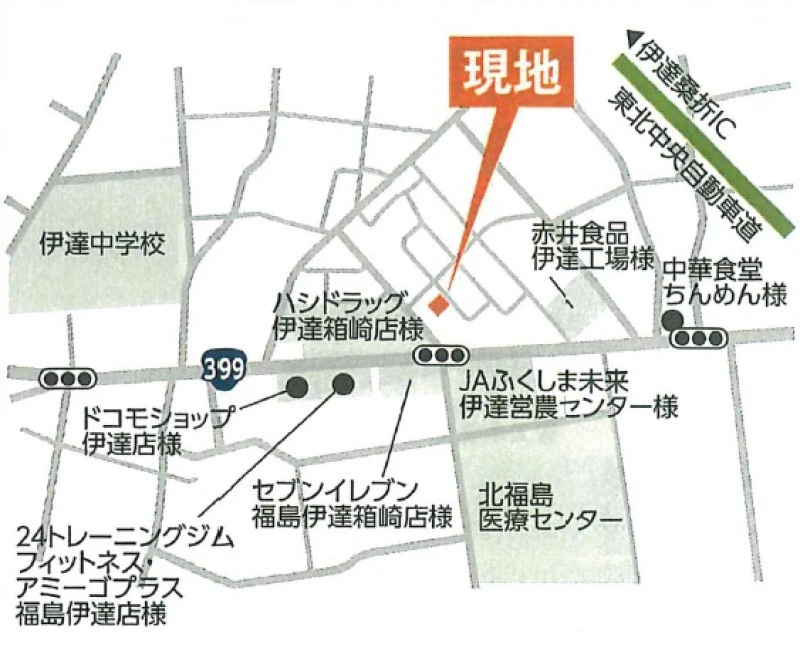 ※地図上の「対象地」は「福島県伊達市箱崎字布川 」付近を示しています。実際の場所ではない場合がございます。詳しくはお問い合わせください。