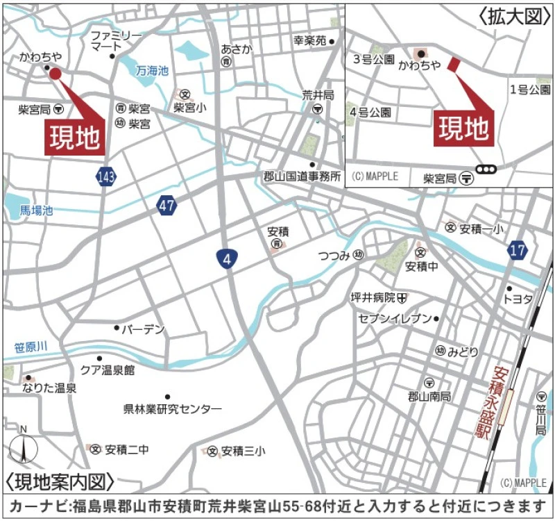 ※地図上の「対象地」は「福島県郡山市安積町荒井字柴宮山 」付近を示しています。実際の場所ではない場合がございます。詳しくはお問い合わせください。