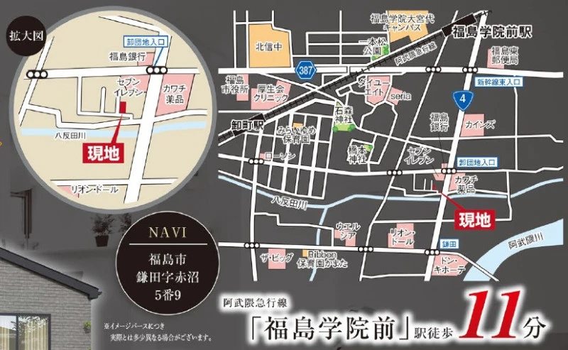 阿武隈急行 福島学院前駅 徒歩11分 (832m) 阿武隈急行 卸町駅 徒歩12分 (951m) JR東北本線 東福島駅 徒歩27分 (2150m) |