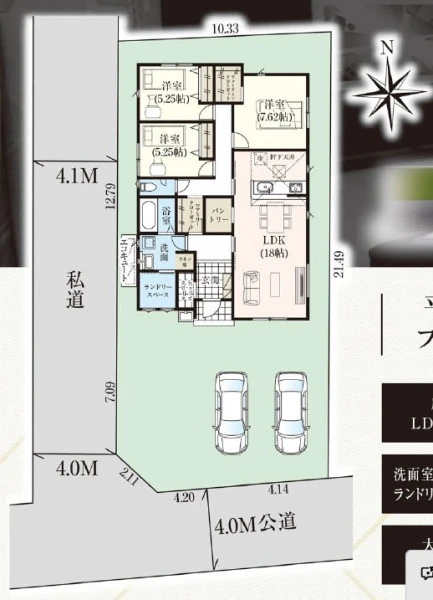 | 設備 | 上水道、複層ガラス、モニタ付インターホン、カウンターキッチン、システムキッチン、3口以上コンロ、バス、シャワー、追焚機能、浴室乾燥機、浴室に窓、浴室暖房、トイレ2箇所、温水洗浄便座、洗面台、洗面所、シャンプードレッサー、床下収納、IHクッキングヒーター、オール電化、電気、下水道、駐車2台可 | ||