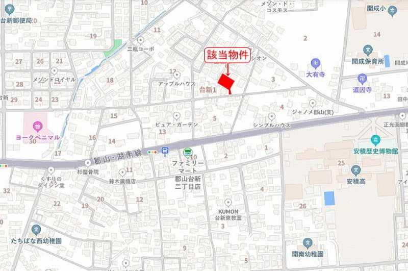 ※地図上の「対象地」は「福島県郡山市台新1丁目 」付近を示しています。実際の場所ではない場合がございます。詳しくはお問い合わせください。