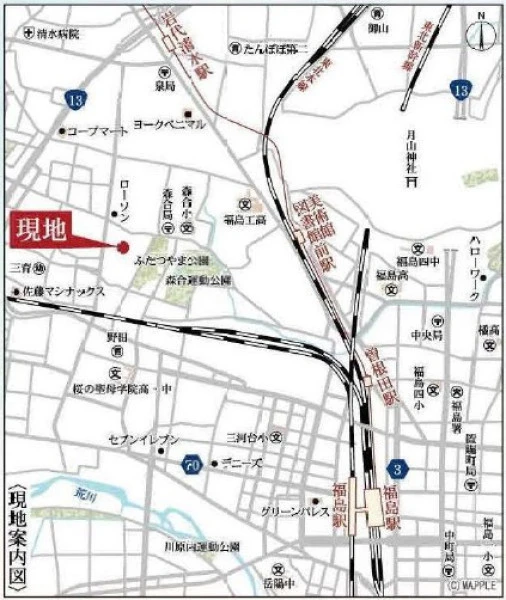 ※地図上の「対象地」は「福島県福島市野田町字相沢 」付近を示しています。実際の場所ではない場合がございます。詳しくはお問い合わせください。