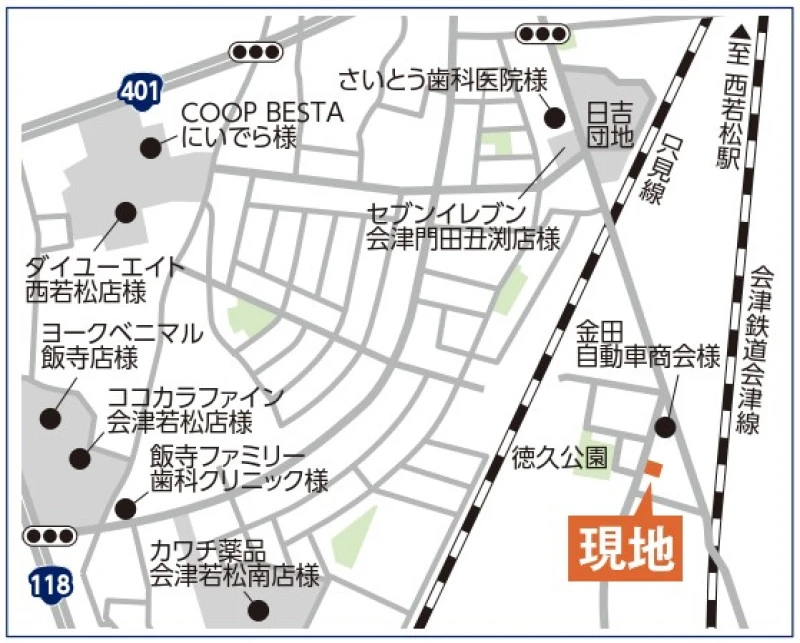 JR只見線 西若松駅 徒歩21分 (1661m) 会津鉄道 南若松駅 徒歩21分 (1670m) |