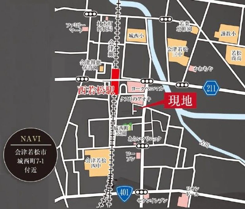 JR只見線 西若松駅 徒歩7分 (548m) JR只見線 七日町駅 徒歩29分 (2265m) |