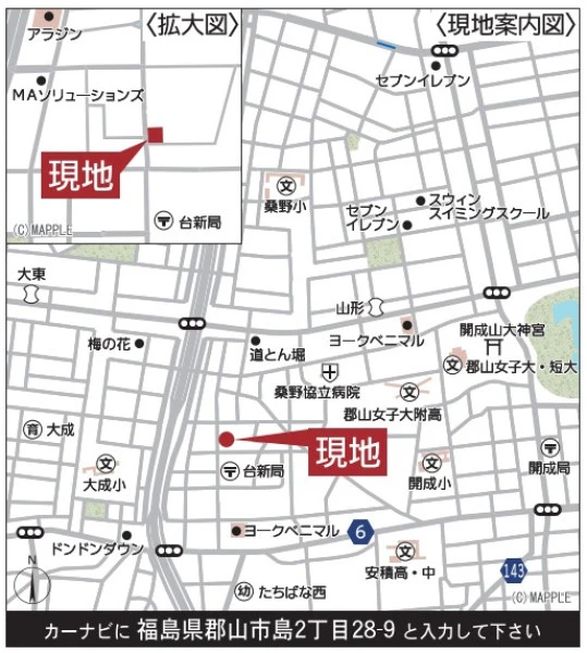 ※地図上の「対象地」は「福島県郡山市島2丁目 」付近を示しています。実際の場所ではない場合がございます。詳しくはお問い合わせください。