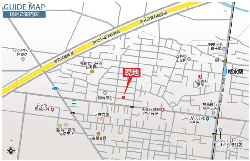 ※地図上の「対象地」は「福島県福島市笹谷字桜水 」付近を示しています。実際の場所ではない場合がございます。詳しくはお問い合わせください。