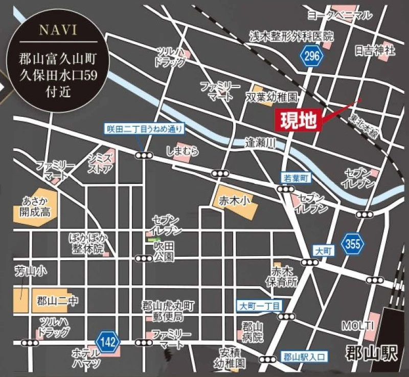 ※地図上の「対象地」は「福島県郡山市富久山町久保田字水口 」付近を示しています。実際の場所ではない場合がございます。詳しくはお問い合わせください。