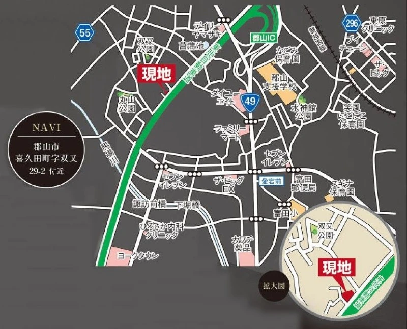 ※地図上の「対象地」は「福島県郡山市喜久田町字双又 」付近を示しています。実際の場所ではない場合がございます。詳しくはお問い合わせください。