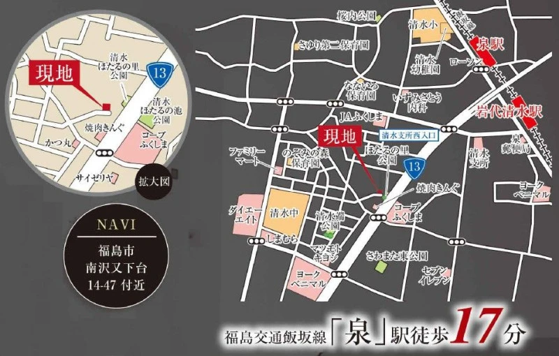 福島交通飯坂線 岩代清水駅 徒歩11分 (875m) 福島交通飯坂線 泉駅 徒歩11分 (832m) 福島交通飯坂線 上松川駅 徒歩20分 (1548m) |