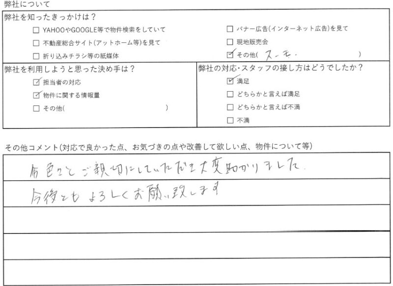 ◆弊社を知ったきっかけは?「スーモ」 ◆弊社を利用しようと思った決め手は?「担当者の対応」「物件に関する情報量」 ◆弊社の対応・スタッフの接し方はどうでしたか?「満足」 ◆その他コメント「色々とご親切にしていただき大変助かりました。今後ともよろしくお願いいたします。」