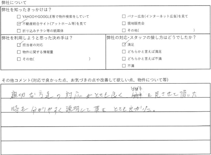 ◆弊社を知ったきっかけは?「不動産総合サイト(アットホーム等を見て」 ◆弊社を利用しようと思った決め手は?「担当者の対応」◆弊社の対応・スタッフの接し方はどうでしたか?「満足」 ◆その他コメント「親切な方達の対応がとても良く、物件を見せて頂いた時も分かりやすく説明して頂きとてもよかった。」