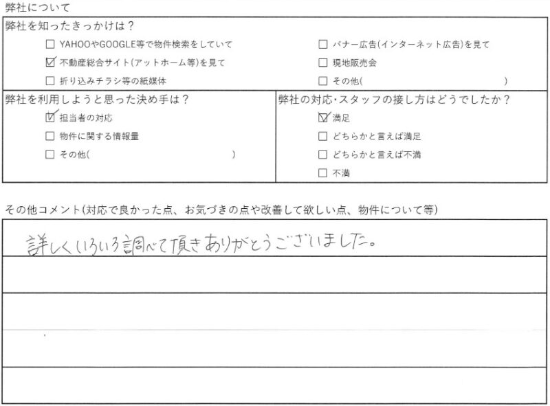 ◆弊社を知ったきっかけは?「不動産総合サイト(アットホーム等)を見て」 ◆弊社を利用しようと思った決め手は?「担当者の対応」 ◆弊社の対応・スタッフの接し方はどうでしたか?「満足」 ◆その他コメント「詳しくいろいろ調べて頂きありがとうございました。」