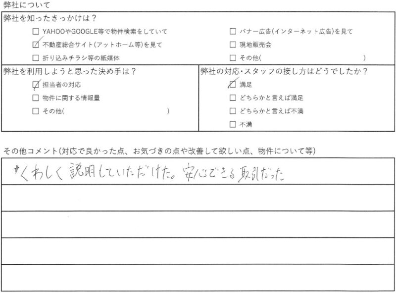 ◆弊社を知ったきっかけは?「不動産総合サイト(アットホーム等)を見て」 ◆弊社を利用しようと思った決め手は?「担当者の対応」 ◆弊社の対応・スタッフの接し方はどうでしたか?「満足」 ◆その他コメント「くわしく説明していただけた。安心できる取引だった。」