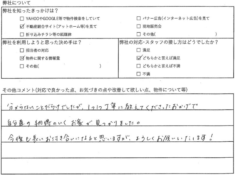 ◆弊社を知ったきっかけは?「YAHOOやGOOGLE等で物件検索をしていて」 ◆弊社を利用しようと思った決め手は?「物件に関する情報量」◆弊社の対応・スタッフの接し方はどうでしたか?「どちらかといえば満足」 ◆その他コメント「分からないことだらけでしたが1つ1つ丁寧に教えてくださったおかげで自分たちの納得のいくお家が見つかりました。今後も長いお付き合いになると思いますが、よろしくお願いいたします!」