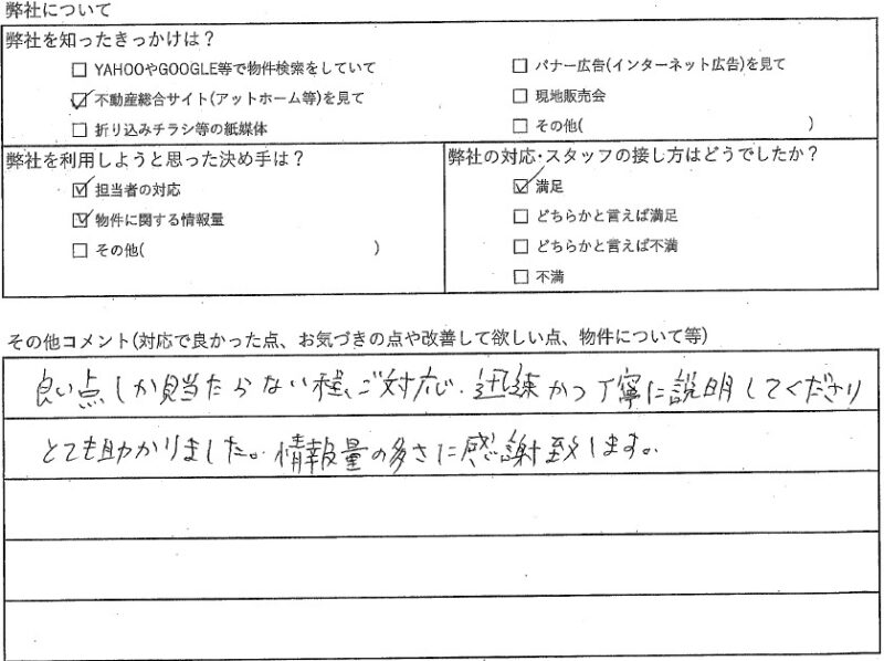 ◆弊社を知ったきっかけは?「不動産総合サイト(アットホーム等)を見て」 ◆弊社を利用しようと思った決め手は?「担当者の対応」「物件に関する情報量」◆弊社の対応・スタッフの接し方はどうでしたか?「満足」 ◆その他コメント「良い点しか見当たらない程、ご対応、迅速かつ丁寧に説明してくださりとても助かりました。情報量の多さに感謝いたします。」
